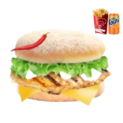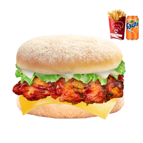 Pain fariné, Morceau poulet mariné à la Crème Fraîche, Sauce revisitée, Cheddar
