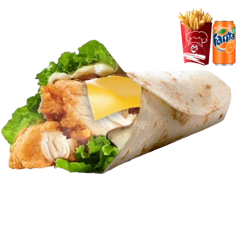 Tortilla, Tender de poulet croustillant, Salade, Sauce mayonnaise revisitée, cheddar