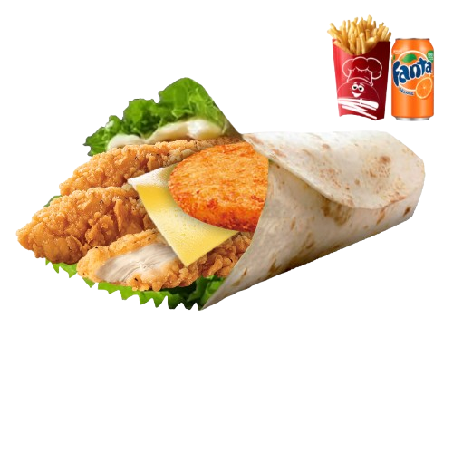Tortilla, Tender de poulet croustillant, Galette de pomme de terre, Salade, Sauce mayonnaise revisité, cheddar