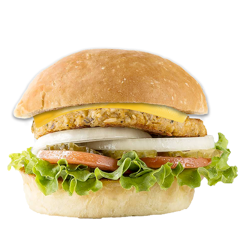 Pain buns patate, Galette de légumes, Ketchup, Salade, Tomate, Oignons, Cheddar