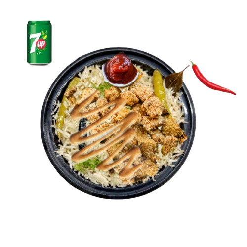 Riz Spécial (fait maison), Sauce Thaï maison, Onion frie, Persil, Poulet Pané maison.
